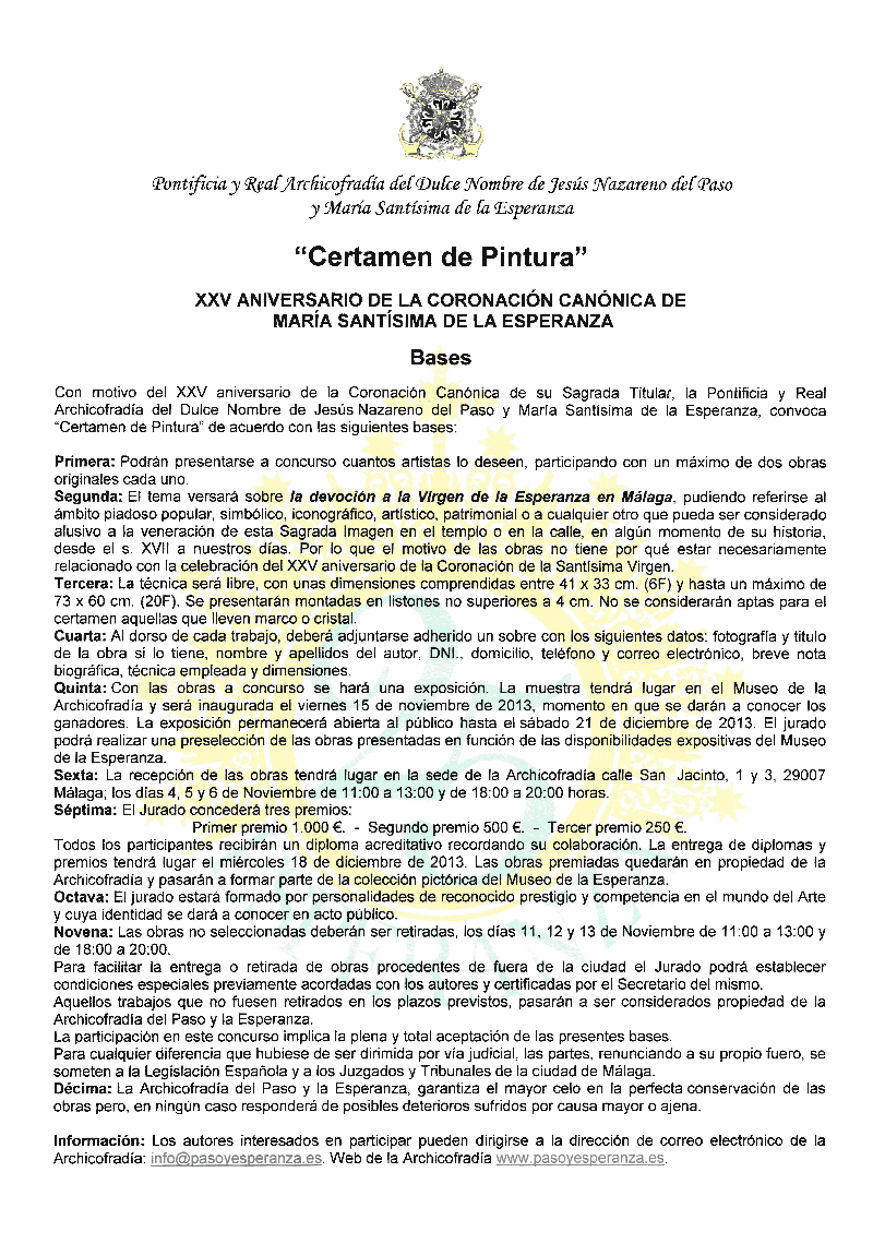 BASES CERTAMEN DE PINTURA XXV ANIVERSARIO DE LA CORONACIÓN CANÓNICA DE MARÃA SANTÃSIMA DE LA ESPERANZA.