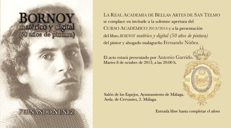 Apertura del Curso Académico 2013-2014 de la Real Academia de Bellas Artes de San Telmo y presentación del libro Bornoy matérico y digital (50 años de pintura) del pintor y abogado Fernando Núñez- Martes 8 de octubre de 2013 a las 20.00 horas.